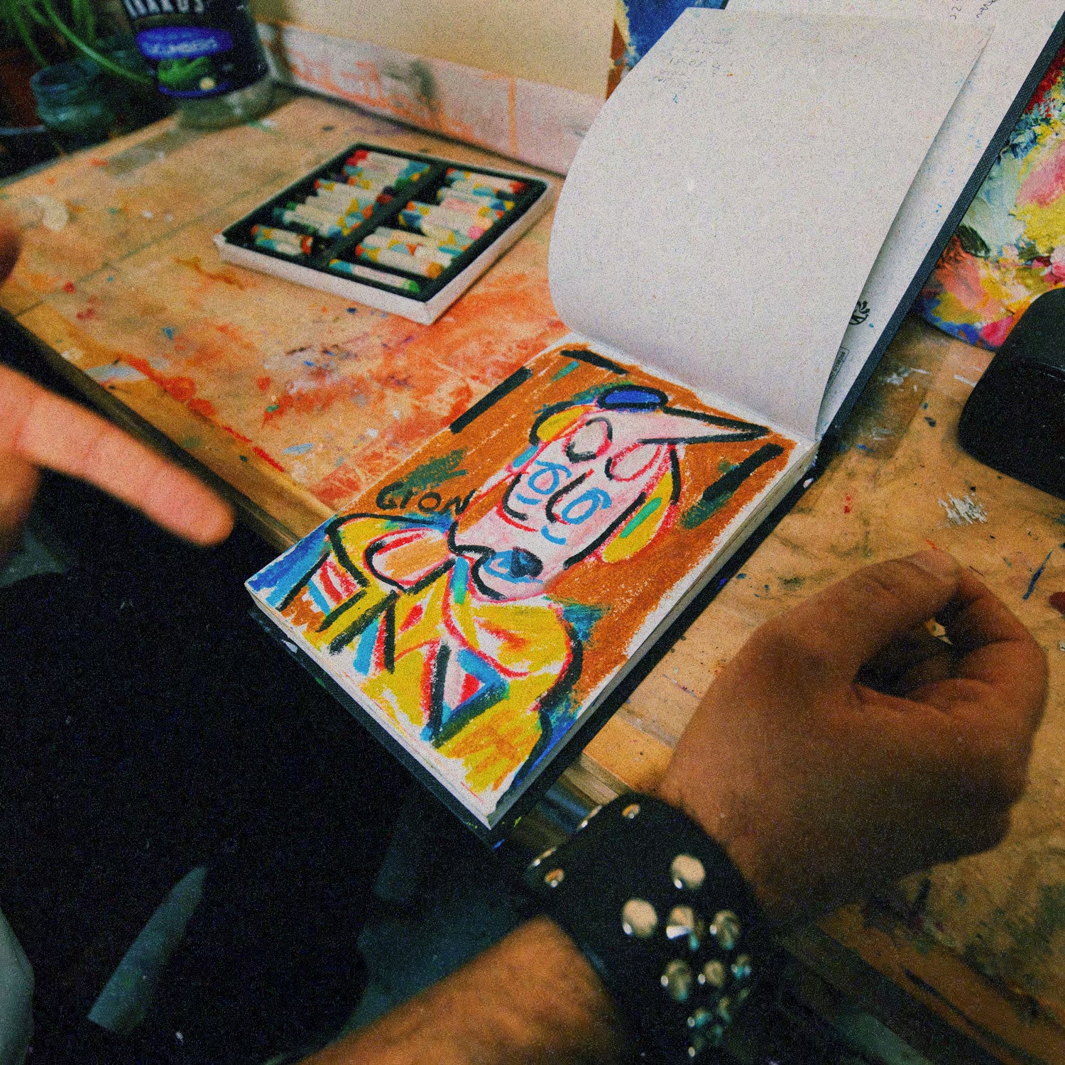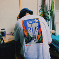 Volto means "face" in Italian. This series was born from the artist Gioniatan Scali’s travels between Berlin and Turin in summer 2025, moments of escape, reflection, and searching for human connection. Using just twelve oil pastels, each face is drawn without plan, pure gesture, unfiltered response. Inspired by expressions seen on daily walks, fear, joy, apathy, and vulnerability. The Volti (Faces) series captures the soul behind a glance. In collaboration with Idioma Ltd., we chose to highlight face number 6. This t-shirt carries the story of expression, freedom, and the need to see and be seen.